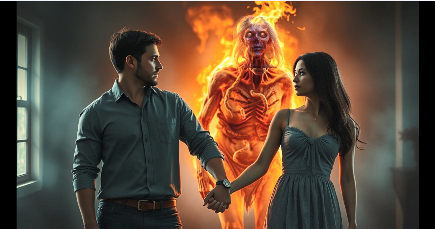 Vanessa sonrió, sintiendo una paz profunda. Sin embargo, en ese instante, un sonido perturbador rompió el silencio, seguido por una voz espectral y desgarradora. Al volverse, ambos vieron a una mujer de aspecto aterrador, con una piel demacrada, enrojecida y plagada de gusanos, envuelta en llamas como si el propio infierno la consumiera.