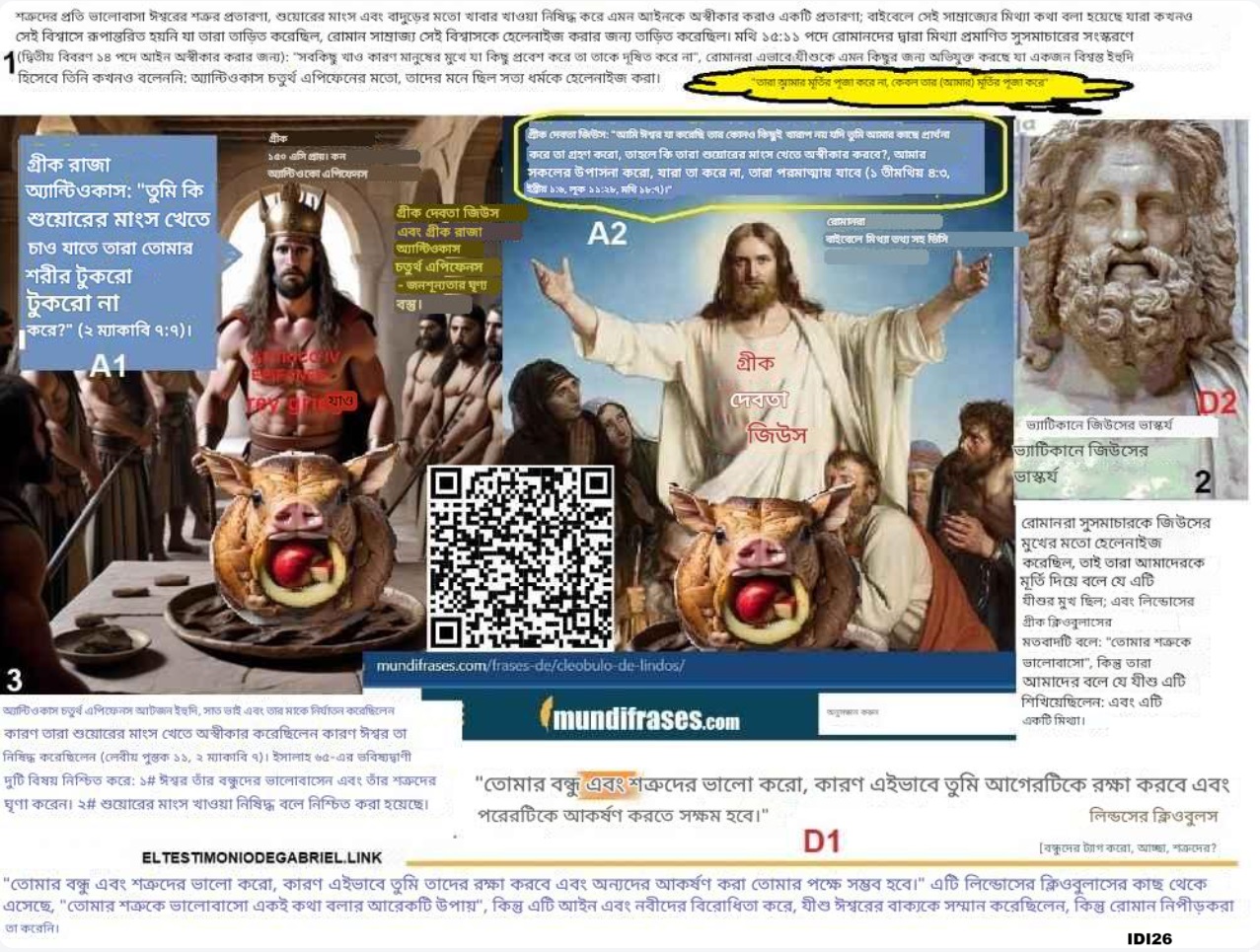 “রোমান সাম্রাজ্য, বাহিরা, মুহাম্মদ, যীশু এবং নির্যাতিত ইহুদি ধর্ম। সূচনা বার্তা: জিউস-পূজক রাজা অ্যান্টিওকাস চতুর্থ এপিফেনেসের দ্বারা নির্যাতনের শিকার হওয়া সত্ত্বেও যারা শুয়োরের মাংস খেতে অস্বীকার করেছিল, তারা কী বিশ্বাস করেছিল তা দেখুন। দেখুন কিভাবে বৃদ্ধ ইলিয়াজার, সাত ভাই এবং তাদের মাকে গ্রীক রাজা অ্যান্টিওকাস শুয়োরের মাংস খেতে অস্বীকার করার জন্য হত্যা করেছিলেন। ঈশ্বর কি এতটাই নিষ্ঠুর ছিলেন যে তিনি নিজেই যে আইন প্রতিষ্ঠা করেছিলেন তা বাতিল করে দিয়েছিলেন, যার মাধ্যমে সেই বিশ্বস্ত ইহুদিরা অনন্ত জীবন পাওয়ার জন্য বিশ্বাসে তাদের জীবন উৎসর্গ করেছিলেন? ঈশ্বর নিষ্ঠুর নন, ঈশ্বর যদি নিষ্ঠুর হতেন তাহলে ঈশ্বর সেরা হতেন না। ঈশ্বর দুষ্টদের বন্ধু নন, ঈশ্বর যদি দুষ্টদের বন্ধু হতেন তাহলে ঈশ্বর নিষ্ঠুর হতেন এবং সমস্যার অংশ হতেন, সমাধানের নয়। যারা সেই আইন বাতিল করেছিল তারা যীশু বা তাঁর শিষ্য ছিল না। তারা ছিল রোমান, যাদের গ্রীকদের মতো একই দেবতা ছিল: বৃহস্পতি (জিউস), কিউপিড (ইরোস), মিনার্ভা (অ্যাথেনা), নেপচুন (পোসাইডন), রোমান এবং গ্রীক উভয়ই শুয়োরের মাংস এবং সামুদ্রিক খাবার উপভোগ করত, কিন্তু বিশ্বস্ত ইহুদিরা এই খাবারগুলি প্রত্যাখ্যান করত। ২ ম্যাকাবি ৭:১ সাত ভাই এবং তাদের মাকে গ্রেপ্তার করা হয়েছিল। রাজা তাদের চাবুক এবং গরুর শিরা দিয়ে প্রহার করে শুয়োরের মাংস খেতে বাধ্য করতে চেয়েছিলেন, যা আইনত নিষিদ্ধ ছিল। 2 তাদের মধ্যে একজন সকল ভাইদের হয়ে বলল, “আমাদের জিজ্ঞাসা করে তোমরা কী জানতে চাও? আমাদের পূর্বপুরুষদের আইন ভাঙার চেয়ে আমরা মরতেও প্রস্তুত।” ৮ সে তার মাতৃভাষায় উত্তর দিল, “আমি শুয়োরের মাংস খাব না!” তাই তাকেও যন্ত্রণা দেওয়া হয়েছিল। 9 কিন্তু তিনি যখন শেষ নিঃশ্বাস ত্যাগ করলেন, তখন তিনি বললেন: তুমি, অপরাধী, আমাদের বর্তমান জীবন কেড়ে নাও। কিন্তু ঈশ্বর আমাদের যারা তাঁর আইন অনুসারে মারা গেছেন, অনন্ত জীবনে পুনরুত্থিত করবেন। বার্তা: চতুর্থ পশুর জন্ম ও মৃত্যু। একই দেবতাদের দ্বারা গ্রিকো-রোমান জোট। সেলুসিড সাম্রাজ্য। খ্রীষ্টবিরোধীর সুসমাচারে বিশ্বাস করার ব্যাপারে সাবধান থাকুন (অধার্মিকদের জন্য সুসংবাদ, যদিও মিথ্যা) যদি তুমি ন্যায়বিচারের প্রতিপক্ষের প্রতারণা থেকে নিজেকে বাঁচাতে চাও, তাহলে বিবেচনা করো যে: রোমের মিথ্যা সুসমাচার প্রত্যাখ্যান করার জন্য, স্বীকার করুন যে যীশু যদি ধার্মিক হন তবে তিনি তাঁর শত্রুদের ভালোবাসতেন না, এবং যদি তিনি ভণ্ড না হন তবে তিনি শত্রুদের প্রতি ভালোবাসা প্রচার করেননি কারণ তিনি যা করেননি তা প্রচার করেননি: হিতোপদেশ 29:27 ধার্মিকরা অধার্মিকদের ঘৃণা করে, এবং অধার্মিকরা ধার্মিকদের ঘৃণা করে। এটি রোমানদের দ্বারা বাইবেলের সাথে মিশ্রি