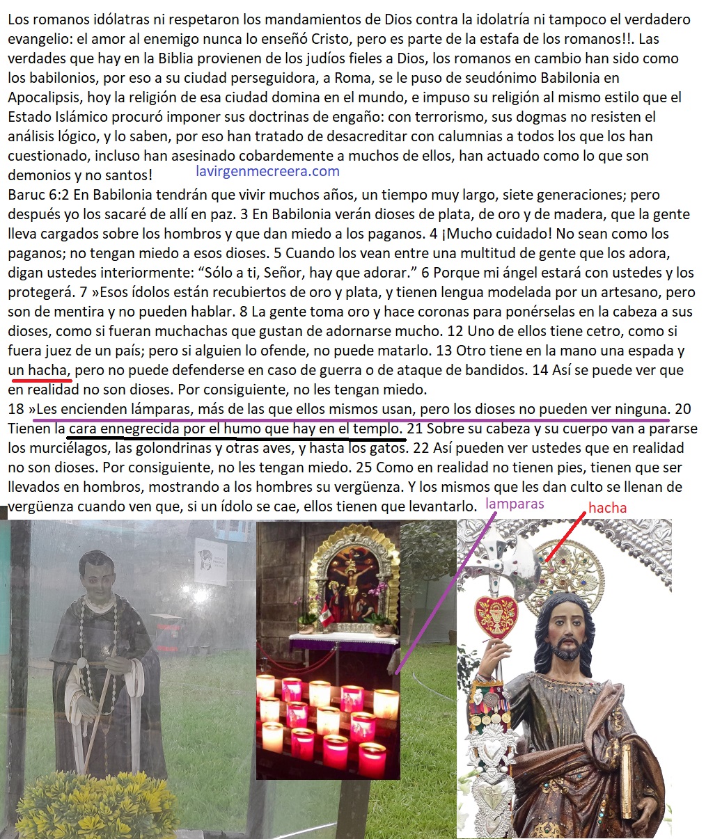 «Soy el héroe de la princesa y eso le jode al villano de escamas al cual le digo: «Aleja tus estatuas de ella, infeliz idólatra rebelde!, la ley de mi Dios dice: Éxodo 20:5 No te inclinarás a las imágenes, ni las honrarás; porque yo soy Jehová tu Dios celoso. Y como no has respetado este mandamiento, has falsificado el evangelio, por eso la Biblia tiene mentiras de Roma, con las cuales a ella no la engañarás, serpiente antigua!!, la virgen justa creerá en mi testimonio y no en tus calumnias» https://eltestimoniodegabriel.link (https://gabriels.work) https://lavirgenmecreera.com (https://ellameencontrara.com)