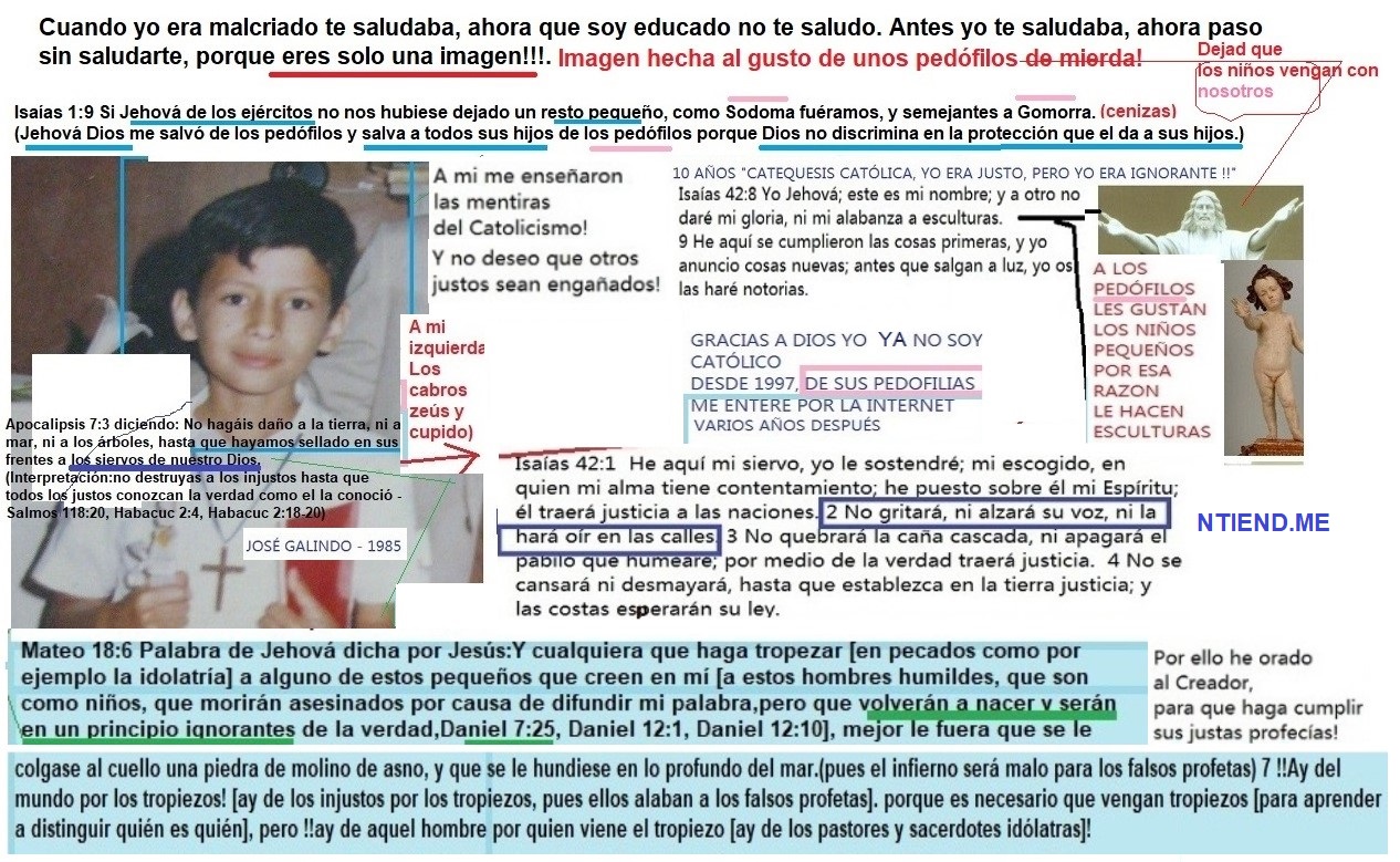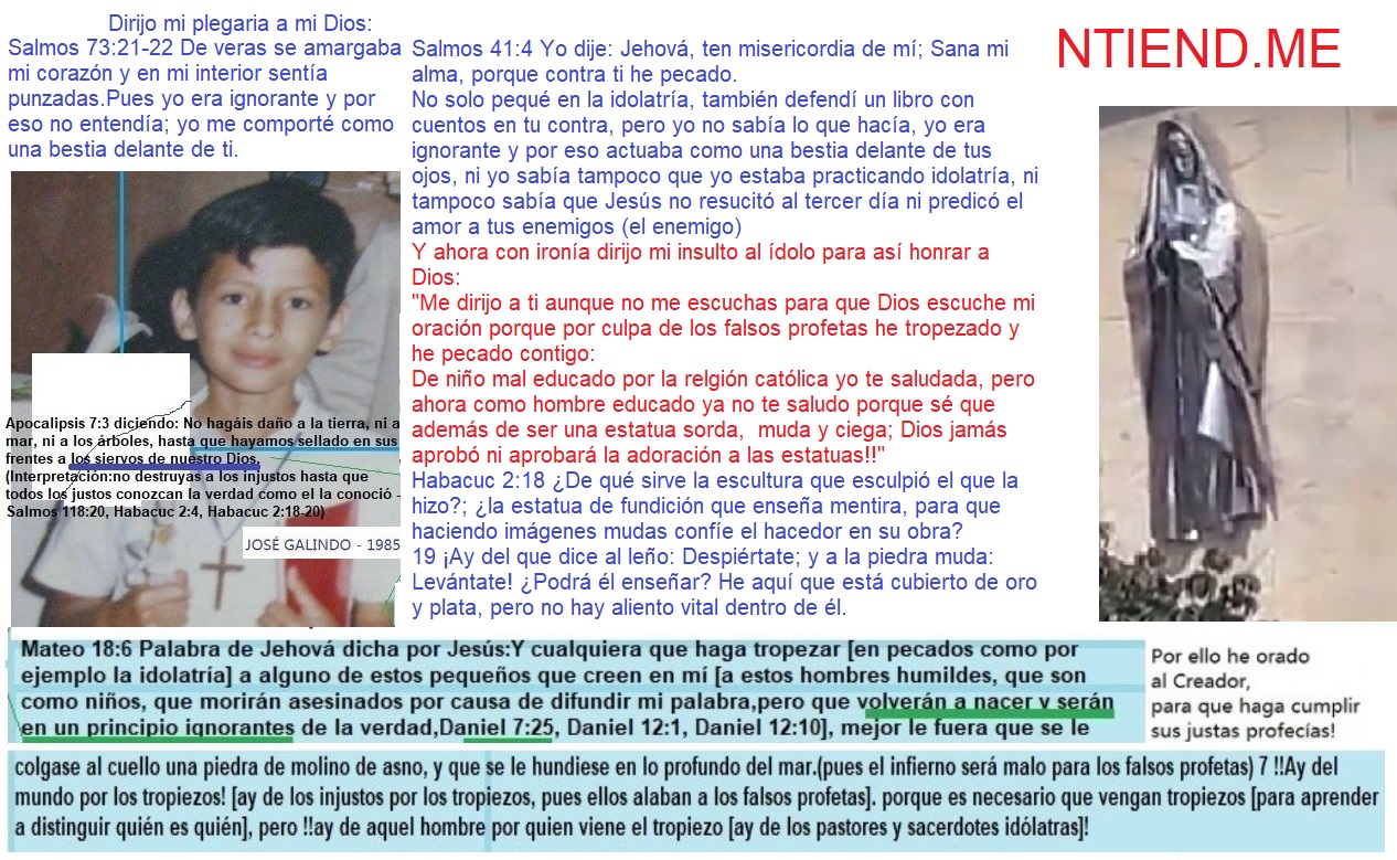 «Soy el héroe de la princesa y eso le molesta al Diablo al cual le digo: «Aleja tus estatuas de ella, ¡infeliz idólatra rebelde!, la ley de mi Dios dice: Éxodo 20:5 No te inclinarás a las imágenes, ni las honrarás; porque yo soy Jehová tu Dios celoso. Y como no has respetado este mandamiento, has falsificado el evangelio, por eso la Biblia tiene mentiras de Roma, con las cuales a ella no la engañarás, serpiente antigua!!, la virgen justa creerá en mi testimonio y no en tus calumnias» https://eltestimoniodegabriel.link (https://gabriels.work) https://lavirgenmecreera.com (https://ellameencontrara.com)