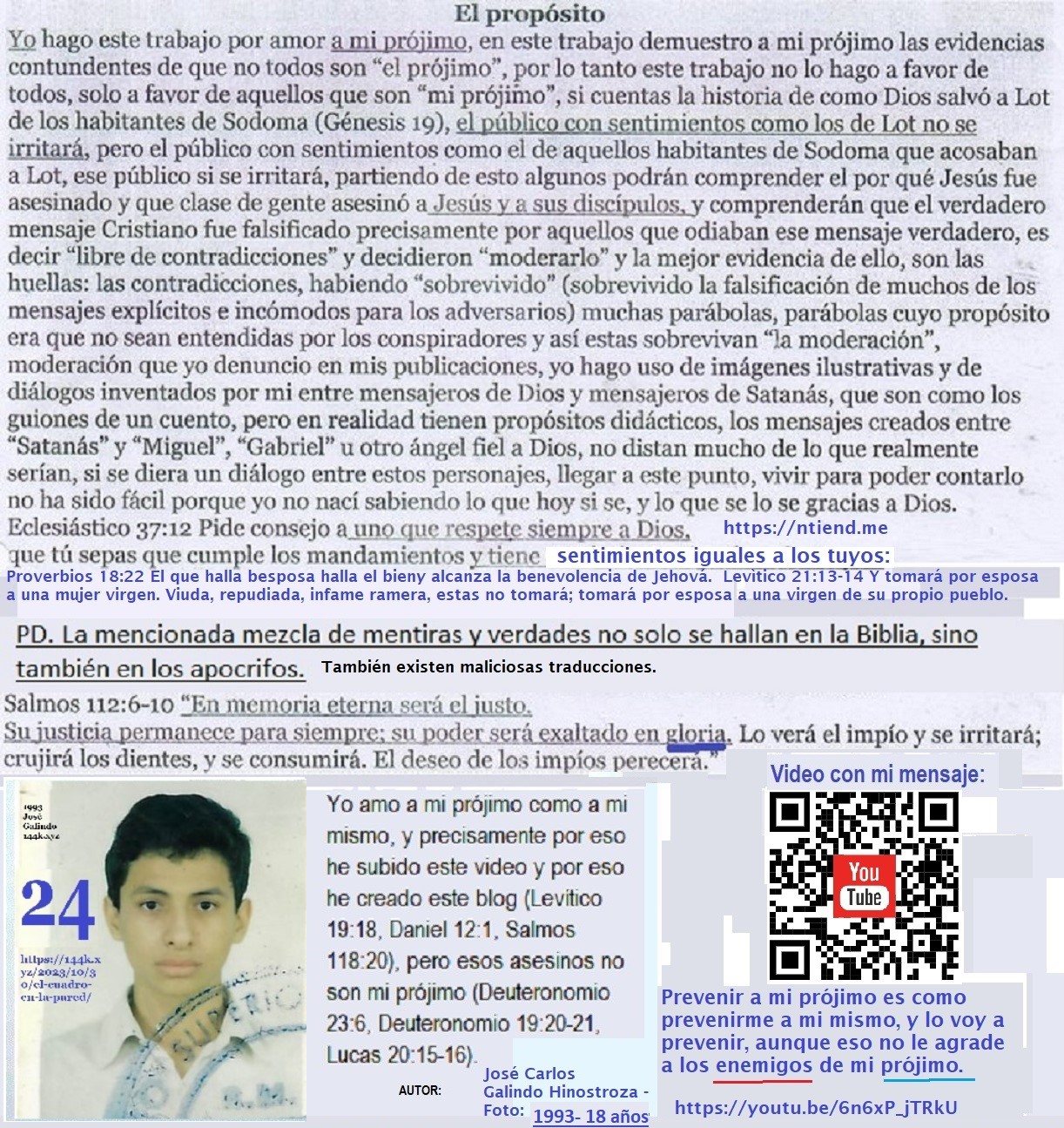La revelación del fin de los tiempos: Daniel 12:9-10 Él respondió: Anda, Daniel, pues estas palabras están cerradas y selladas hasta el tiempo del fin (Apocalipsis 10:5-7, Daniel 12:7). Muchos justos serán limpios [de sus pecados], y emblanquecidos y purificados [Proverbios 28:13, Salmos 112:4, Deuteronomio 14, Salmos 118:13-20]; los inicuos procederán inicuamente, y ninguno de los inicuos entenderá (Proverbios 11:9), pero los entendidos comprenderán (Isaías 11:4, Proverbios 11:8, Isaías 6:10-13, Daniel 2:43-44). Proverbios 28:5 Los hombres malos no entienden el juicio; Pero los que buscan a Jehová sí lo entienden. El Apocalipsis: La virgen creerá el mensaje del ángel Gabriel y así será la derrota de la Serpiente. Eclesiástico 12:1 Cuando hagas el bien, presta atención a quién, y podrás esperar algo de tu buena acción. 2 Haz un favor al justo y recibirás la recompensa, si no de él, al menos del Señor. 3 Ayudar al injusto no trae ningún bien, y ni siquiera es hacer una buena acción. 4 En el momento de necesidad, os hará doble daño por todo el bien que le habéis hecho. 5 No le deis armas de guerra, no sea que os ataque con ellas. Creo que existe Dios y también creo que existe gente como yo, pero no me adoro a mí mismo ni tampoco adoro a las personas que son como yo, ni adoro a criatura alguna, por eso soy henoteísta, si buscas su significado en el diccionario sabrás el buen concepto que tengo de mí mismo, motivo de muchas envidias y calumnias, por cierto. (Apocalipsis 14:3 Y cantaban un cántico nuevo delante del trono y delante de los cuatro seres vivientes y de los ancianos; y nadie podía aprender el cántico, sino los ciento cuarenta y cuatro mil que habían sido rescatados de la tierra. https://144k.xyz Daniel 12:10 Muchos serán limpios, y emblanquecidos y purificados; los impíos procederán impíamente, y ninguno de los impíos entenderá, pero los entendidos comprenderán. Este mensaje está dirigido a esos justos, a esa gente como yo, a esos 144000 https://144k.xyz, ellos entienden de justicia: “Entiéndeme!”- https://ntiend.me )