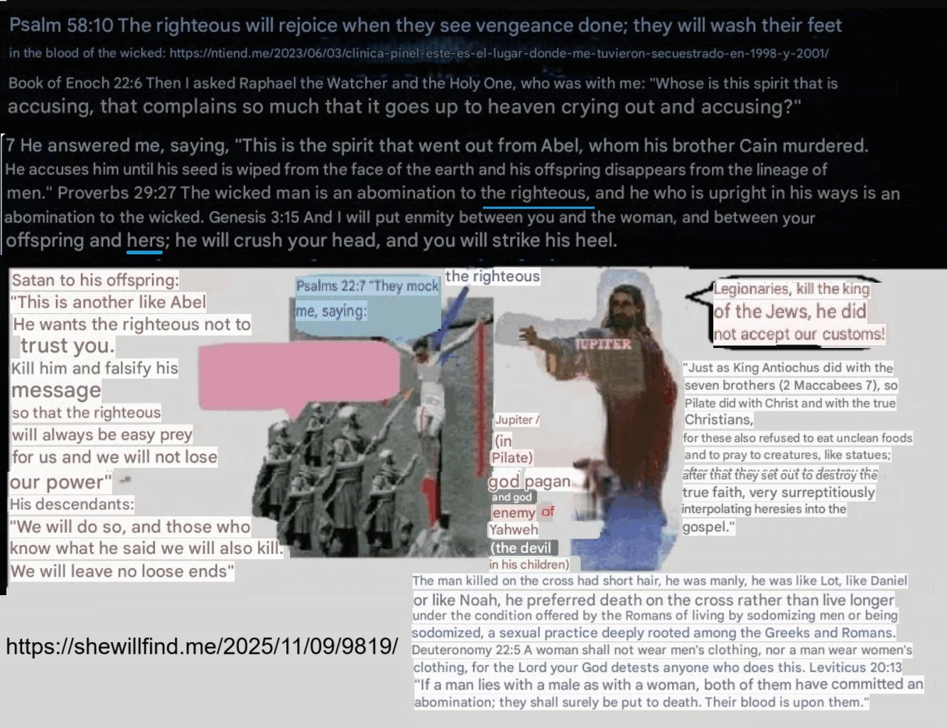 Todos los días la misma estúpida canción, la misma estúpida pirueta con una pelota ensalzada, y las mismas estúpidas soluciones aplicadas.의로운 처녀는 나를 믿고, 뱀의 거짓된 종교의 인정을 구하지 않고 나와 결혼할 것이다. 그 뱀은 돈을 대가로 의로운 사람들의 이상을 멸시하고, 그들을 진정한 이익에 반하도록 비방하였다. 레위기 21:13 ‘그는 처녀를 아내로 맞이해야 한다.’ 14 ‘과부나 이혼한 여자, 더럽혀진 여자나 창녀를 아내로 맞이하지 말고, 자기 백성 중의 처녀를 아내로 삼아야 한다.’ 15 ‘그의 백성 가운데서 자손을 더럽히지 않도록 하라. 나 여호와는 그를 거룩하게 하는 이다.’ 그 뱀은 토가를 입고 돼지고기를 먹는 등 그리스의 전통을 옹호하기 위해 거짓된 메시지에 의존하였다. 뱀의 말: ‘하나님이 정말로 ‘그 열매(돼지고기)를 먹지 말라’고 말씀하셨느냐? … 하나님이 지으신 것은 감사함으로 받으면 나쁜 것이 없다.’ 그 뱀은 하나님을 모독하였다. 왜냐하면 로마는 의로운 자의 말씀을 옹호하지 않고, 오히려 뱀의 말을 하나님의 말씀인 것처럼 전파하며 ‘하나님은 모든 사람을 사랑하신다. 그러므로 구원은 원수를 사랑하는 데 있다.’라고 말했기 때문이다. 그것은 마치 ‘독이 말로 독이 아니게 된다’거나 ‘배신자가 친절히 대하면 배신자가 아니게 된다’고 말하는 것과 같다. 그러나 하나님의 사랑은 선택된 자들에게만 주어진다. 나훔 1:2 ‘여호와는 질투하시며 보복하시는 하나님이시다. 여호와는 보복하시며 분노하신다. 여호와는 대적들에게 보복하시고 원수들에게 진노를 간직하신다.’ 나훔 1:7 ‘여호와는 선하시며 환난 날에 피난처시다. 그는 자기를 신뢰하는 자를 아신다.’ 8 ‘그러나 넘치는 홍수로 그 대적들을 멸하시며, 어둠이 그 원수들을 따르리라.’ 하나님의 신성한 보호는 오직 의인들에게만 주어진다. 시편 5:11 ‘주의 피난처에 들어가는 자마다 기뻐하게 하시며, 영원히 즐겁게 노래하게 하소서. 주께서 그들을 보호하시기 때문입니다.’