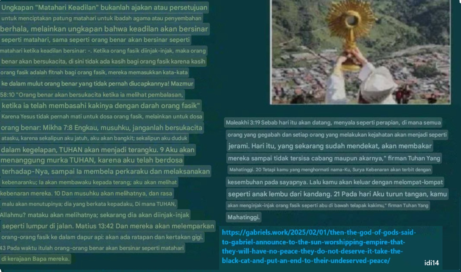 https://shewillfind.me/wp-content/uploads/2025/11/idi11-judgment-against-babylon-romanian.docx .” “Ce este idolatria? Se referă Apocalipsa 14:9-10 la răi și la idolatria lor? [Mesaj din: 19 aprilie 2025, Lima – Peru. (De José Carlos Galindo Hinostroza – 49 de ani) naodanxxii.wordpress.com] Mai întâi un rezumat, apoi detalii: Imaginea fiarei: Orice idol. A avea semnul fiarei: Fiind o fiară. A fi o fiară înseamnă a fi o persoană nedreaptă. Dar a fi păcătos nu înseamnă neapărat a nu fi neprihănit, pentru că dacă cei drepți nu ar putea păcătui, atunci mesajul că numai ei sunt curățați de păcatele lor din Daniel 12:10 nu ar avea niciun sens. A fi o oaie pierdută (o persoană dreaptă care păcătuiește și are nevoie de îndrumare (informații)) nu este niciodată același lucru cu a fi lup. Persoana nedreaptă este ca lupul, dar oaia cu știință nu se mai pierde în păcatele provocate de lup (păcate împotriva dreptății, împotriva lor înșiși), iar oaia cu știință este ca un leu care devorează lupii, nu invers. Uite, cine ți-a explicat asta înainte atât de logic și clar? Acum puteți începe să distingeți diferențele. Incapacitatea unora de a scăpa de idolatrie este un semn de apartenență la o altă împărăție (Este semnul fiarei pe frunte și pe mâna despre care se vorbește pe pistă în Apocalipsa 14, în relație directă cu Apocalipsa 13:18 și Daniel 12:10 (Marc pe frunte: Gândurile, spre deosebire de cei drepți sau neacceptați, sunt ‘cel neprihănit’, ‘cel neprihănit’ că mesajele incoerente sunt un semn de înșelăciune, se încăpățânează ca un catâr și se agață de tradiție întorcând spatele rațiunii, defăimător este sfârșitul incoerenței, deoarece calomnia este inconsecventă cu adevărul: Mark pe mână (acțiuni): Nu se poate decât să continue cu idolatrie, oricât de mult este informat despre asta și nu, nu sunt la fel de mult naturile sunt diferite. Există două părți dușmane: cel drept și cel rău. Drepții sunt grâul, lumina, adevărul. Cei răi sunt neghina, întunericul, calomnia. Nu există pace între ei, doar dușmănie. Simbolul dragonului (yin-yangul) reprezintă amestecul nedrept: ei vor ca grâul să îmbrățișeze neghina, copiii luminii să-i vadă pe cei răi ca pe frați. Amestecul acela este o capcană. Adevăratul plan al lui Dumnezeu este separarea veșnică, nu unirea cu cei răi. 🔹 Isaia 26:2 – ‘Deschideți porțile, ca să intre neamul drept, care păzește adevărul.’ 🔹 Daniel 12:10 – ‘Cei răi vor face rău și nimeni dintre cei răi nu va înțelege, dar cei înțelepți vor înțelege.’ 🔹 Isaia 26:10 – ‘Să se arate favoare celor răi, dar el nu va învăța dreptatea; în țara dreptății va face nedreptate și nu va vedea măreția Domnului.’ 🔹 Psalmul 37:12 – ‘Cel rău unelește împotriva celui neprihănit și scrâșnește din dinți împotriva lui.’ Romanii au stricat mesajul spunând: ‘Iubește-ți dușmanii’. Dar dușmanii binelui nu se schimbă. Ei caută doar să-i distrugă pe cei drepți. Ca și Mihail în Apocalipsa 12, drepții trebuie să lupte, nu să se predea. Nu toți sunt copii ai lui Dumnezeu. Doar cei care iubesc adevărul și dreptatea. Matei 13:30 Lăsați amândoi să crească împreună până la seceriș. Și la vremea secerișului, le voi spune secerătorilor: ‘Strângeți mai întâi neghina și legați-o în mănunchiuri pentru a fi ars, dar adunați grâul în hambarul meu’. Matei 13:38 Câmpul este lumea; sămânța bună sunt copiii lui Dumnezeu, dar buruienile sunt copiii Diavolului. 39 Vrăjmaşul care le-a semănat este Diavolul; recolta este sfârșitul dezordinei, iar secerătorii sunt îngerii. 41 Îngerii îi vor aduna din împărăția Fiului Omului pe toți cei care nu sunt drepți, 42 și îi vor arunca în cuptorul de foc. Acolo va fi plânsul și scrâșnirea dinților. 43 Atunci cei drepți vor străluci ca soarele în Împărăția lui Dumnezeu, Tatăl celor drepți. Apocalipsa 14:15 ‘Pune secera ta și secera, căci a venit vremea seceririi, căci secerișul pământului este copt.’ 16 Și cel ce ședea pe nor și-a înfipt secera pe pământ, și pământul a fost secerat. (& = Fiul lui Adam (Adam înseamnă ‘omul.’ Abel este o referire la ‘cel neprihănit.’ În acest context, este o referire la drepți în general, deoarece cei drepți sunt chemați să judece (Psalmul 118:20, Daniel 2:43-44, 1 Corinteni 6:2, Apocalipsa 20:4-6)). 🔹 Mulți repetă că toți suntem copii ai lui Dumnezeu, dar asta ne învață faptele și Scriptura? În timp ce lumea promovează unitatea cu toată lumea, Dumnezeu avertizează împotriva idolatriei și a amestecării grâului cu neghina. Această postare explorează ambele subiecte dintr-o perspectivă directă și revelatoare. Idolatria desparte, precum grâul și neghina: cine sunt cu adevărat copiii lui Dumnezeu? Conceptul de idolatrie depinde de idolul despre care vorbim sau depinde de ceea ce se face imaginii sau statuii? Dacă idolatria se înclină în fața unei imagini pentru a onora sau a se ruga unei ființe create, ce face organizațiile religioase diferite de păgânismul de modă veche? Biserica Romano-Catolică spune: Dacă faci asta cu această imagine, nu ești un idolatru deoarece este o imagine autorizată de clubul nostru religios. Dar dacă același lucru se întâmplă cu acea imagine, ești un idolatru pentru că acea imagine nu este autorizată de clubul nostru religios. Deuteronom 4:15-18 – Idolatria este interzisă. Nu ai văzut nicio figură când Dumnezeu ți-a vorbit din foc. Deci fii foarte atent: Nu vă închinați și nu vă rugați nici unei figuri. Să nu faci statui sau imagini cu oameni, animale terestre, păsări ale cerului, reptile, pești de apă sau orice altceva. Nu vă închinați soarelui, lunii sau stelelor. [IMG01] Nu cer bani și nici nu vând nimic. Dreptatea nu 