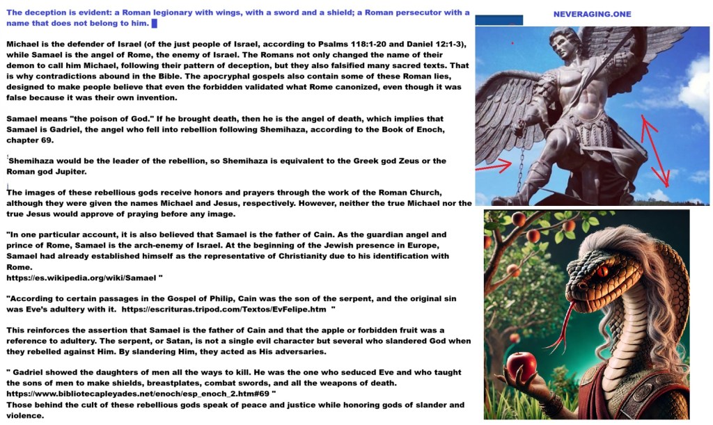 Le serpent, le diable ou Satan (le calomniateur) en enfer (Ésaïe 66:24, Marc 9:44). Matthieu 25:41 : « Alors il dira aussi à ceux qui seront à sa gauche : ‘Retirez-vous de moi, maudits, dans le feu éternel préparé pour le diable et ses anges.’ » Enfer : le feu éternel préparé pour le serpent et ses anges (Apocalypse 12:7-12), pour avoir mélangé vérité et hérésie dans la Bible, le Coran, la Torah, et pour avoir créé de faux évangiles interdits qu’ils ont appelés apocryphes, afin de donner de la crédibilité aux mensonges des faux livres sacrés, tout cela en rébellion contre la justice.