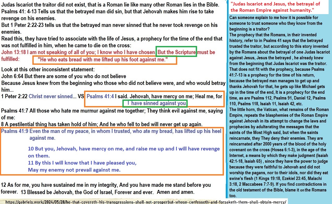 Psalms 41:4 I said, Jehovah, have mercy on me; Heal me, for I have sinned against you. Psalms 41:7 All those who hate me murmur against me together; They think evil against me, saying of me: 8 A pestilential thing has taken hold of him; And he who fell to bed will never get up again. Psalms 41:9 Even the man of my peace, in whom I trusted, who ate my bread, has lifted up his heel against me. 10 But you, Jehovah, have mercy on me, and raise me up and I will have revenge on them. 11 By this I will know that I have pleased you, May my enemy not prevail against me. 12 As for me, you have sustained me in my integrity, And you have made me stand before you forever. 13 Blessed be Jehovah, the God of Israel, Forever and ever. Amen and amen. Can someone explain to me how it is possible for someone to trust someone who they know from the beginning is a traitor? The prophecy that the Romans, in their invented history, refer to in Psalms 41 says that the betrayed trusted the traitor, but according to this story invented by the Romans about the betrayal of one Judas Iscariot against Jesus, Jesus the betrayed , he already knew from the beginning that Judas Iscariot was the traitor. That does not fit with the prophecy, because Psalms 41:7-13 is a prophecy for the time of his return, because the betrayed man manages to get up and thanks Jehovah for that, he gets up like Michael gets up in the time of the end, It is a prophecy for the end time, as are Psalms 112, Psalms 91, Daniel 12, Psalms 110, Psalms 118, Isaiah 11, Isaiah 42, etc. The little horn, the Vatican, what remains of the Roman Empire, repeats the blasphemies of the Roman Empire against Jehovah in its attempt to change the laws and prophecies by adulterating the messages that the saints of the Most High said, but when the saints reincarnate, they They deny their enemies. They are reincarnated after 2000 years of the blood of the holy covenant on the cross (Hosea 6:1-3), in the age of the Internet, a means by which they make judgment (Isaiah 42:1-18, Isaiah 65) , since they have the power to judge because they were faithful to Jehovah and did not worship the pagans, nor to their idols, nor did they eat swine’s flesh (1 Kings 19:18, Ezekiel 23:45, Malachi 3:18, 2 Maccabees 7:7-9). If you find contradictions in the old testament of the Bible, blame it on the Romans too. https://144k.xyz/2024/06/01/the-false-jesus-is-shemihaza-a-satan-requesting-the-worship-for-himself-shemihaza-is-zeus-or-jupiter-in-the-god-father-the-invicible-sun-god-whom-the-romans-worshipped-incarnated-in-their/