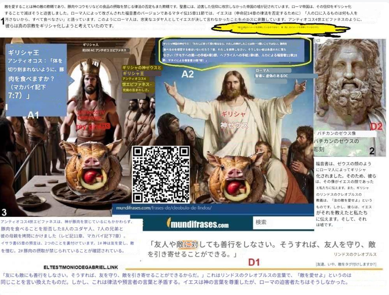 “悪の責任は誰にあるのか、「サタン」か、それとも悪を行う人間か? 愚かな言い訳に騙されないでください。自分の邪悪な行いを「悪魔」のせいにしていますが、実際にはそれは彼ら自身なのです。 堕落した宗教者の典型的な言い訳:「私はこんな人間ではない。悪事を働いているのは私ではなく、私に取り憑いた悪魔なのだ。」 ローマ人は「サタン」として行動し、不公正な内容を作り、それをモーセの律法として広めました。これは正しい教えを貶めるためのものです。聖書には真実だけでなく、嘘も含まれています。 サタンとは「中傷者」を意味するため、血肉を持った存在です。ローマ人はエフェソ6:12の言葉をパウロのものと誤って伝えました。しかし、戦うべき相手は血肉なのです。 民数記35:33では血肉に対する死刑が語られ、ソドムに遣わされた神の天使たちが滅ぼしたのも血肉でした。「天にいる悪の霊的存在」ではありません。 マタイ 23:15 では、パリサイ人が自分たちの弟子をさらに腐敗させると述べられており、外部の影響によって人が不正になる可能性があることを示唆しています。一方で、ダニエル 12:10 では、不正な者はその本性ゆえに不正を行い続け、正しい者だけが正義の道を理解すると述べられています。この二つのメッセージの矛盾は、聖書の一部が互いに対立していることを示しており、その絶対的な真実性に疑問を投げかけます。 https://naodanxxii.wordpress.com/wp-content/uploads/2025/03/idi43-the-plot.pdf .” “ローマ帝国、バヒラ、ムハンマド、イエス、そして迫害されたユダヤ教。 紹介メッセージ: ゼウスを崇拝する王、アンティオコス4世エピファネスに拷問を受けたにもかかわらず豚肉を食べることを拒否した人々が何を信じていたかを見てみましょう。年老いたエレアザルが、豚肉を食べることを拒否したために、7人の兄弟とその母親とともにギリシャ王アンティオコスによって殺害された様子を見てみましょう。 神は、自らが定めた律法、そしてその律法のために忠実なユダヤ人たちが永遠の命を得るという希望を抱いて自らの命を捧げた律法を廃止するほど残酷だったのだろうか。神は残酷ではありません。もし神が残酷なら、神は最高ではないでしょう。神は悪人の友ではありません。もし神が悪人の友であるなら、神は残酷であり、解決策ではなく問題の一部となるでしょう。 その律法を廃止したのはイエスでも弟子でもありませんでした。彼らはギリシャ人と同じ神々を信仰するローマ人でした。 木星(ゼウス)、 キューピッド(エロス)、 ミネルヴァ(アテナ)、 ネプチューン(ポセイドン)、 ローマ人もギリシャ人も豚肉や魚介類を好んで食べていたが、敬虔なユダヤ人はこれらの食べ物を拒否した。 第二マカベア書 7:1 七人の兄弟とその母親が逮捕されました。王は鞭と牛で彼らを殴り、法律で禁じられていた豚肉を彼らに食べさせようとした。 2 彼らのうちの一人が、兄弟たち全員を代表して言った。「わたしたちに質問して、何を知りたいのですか。私たちは先祖の法律を破るくらいなら死ぬ覚悟がある。」 8 彼は母国語でこう答えました。「豚肉は食べません!」 それで彼もまた苦しみを受けました。 9 しかし、彼は息を引き取る時にこう言いました。 犯罪者よ、あなた方は私たちの今の命を奪うのです。しかし、神は、神の律法のために死んだ私たちを永遠の命に復活させてくださいます。 メッセージ: 第四の獣の誕生と死。同じ神々によるギリシャ・ローマ同盟。セレウコス朝。 反キリストの福音を信じないように注意しなさい(偽りではあるが、不義な者にとっては良い知らせである) 正義の敵の欺瞞から自分を救いたいなら、次のことを考慮してください。 ローマの偽りの福音を拒否するには、イエスが義人であったなら敵を愛していなかったこと、そしてイエスが偽善者でなかったなら敵への愛を説いていなかったこと、なぜならイエスは実践していないことを説かなかったからであるということを受け入れなければなりません。箴言 29:27 義人は不義な者を憎み、不義な者は義人を憎む。 これはローマ人によって聖書に改ざんされた福音書の一部です。 ペテロの手紙一 3:18 キリストは、私たちを神のもとに導くために、不義なる者たちのために、一度罪のために死んでくださったのです。 さて、その誹謗中傷を反証する次のものを見てみましょう。 詩篇 118:20 これは主の門である。義人はそこに入るであろう。 21 あなたはわたしの願いを聞き入れ、わたしを救ってくださったので、わたしはあなたに感謝します。 22 建築者たちが捨てた石 礎となりました。 イエスは、自分の死と再臨を予言するたとえ話の中で、敵を呪います。 ルカ 20:14 ところが、ぶどう園の農夫たちはそれを見て、互いに論じ合った。「この人が相続人だ。さあ、彼を殺して、相続財産を我々のものにしよう。 15 そこで彼らは彼をぶどう園の外に追い出し、殺した。 そのとき、ぶどう園の主人は彼らに何を