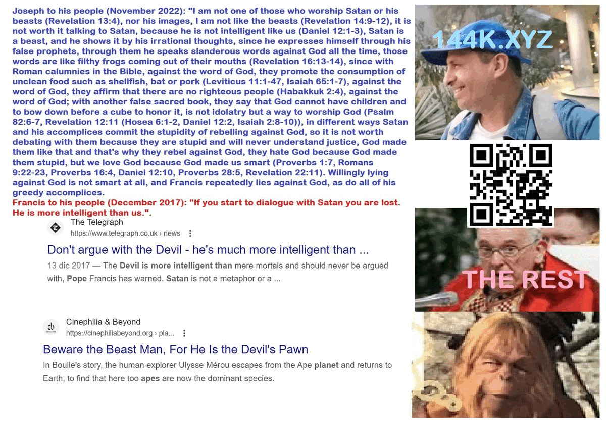 En ze zeggen ook dat de waarheid hun langharige god is, die god Jupiter, de Griekse Zeus die ze met hun beelden verkondigen, ze deden het door een vals evangelie dat over hem zegt: «Ik ben de waarheid, ik ben de deur, aanbid mij al jullie goden (Hebreeën 1:6, Johannes 14:16)». Het was aan te nemen dat die moordenaars de waarheid haatten en dat is waarom ze de ware boodschappen hebben bedrogen en vervalst, en zijn blijven bedriegen door te zeggen: «Wij vervolgen die religie niet langer, nu verspreiden we hem.» Mijn «UFO» NTIEND.ME, straalt licht uit. Dat licht vernietigt de laster van de draak of Satan, wiens naam «de lasteraar» betekent.