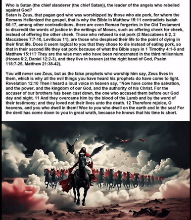 Mensaje de introducción: Satanás significa calumniador, entonces Satanás sí existe porque los falsos testigos sí existen. ¿Quién es Satanás (el principal calumniador (el principal Satanás)), el líder de los ángeles que se rebelaron contra Dios?. Satanás es Zeus, aquel dios pagano que adoraban que comían carne de cerdo, por el cual los romanos helenizaron el evangelio, por eso la Biblia en Mateo 15: 11 contradice Isaías 66: 17, entre otras contradicciones más, incluso hay falsificaciones romanas en el Antiguo Testamento para desacreditar las palabras de justicia en los escritos de Moisés, como el mejilla por mejilla, en lugar de ofrecer la otra mejilla. Los que se negaron a comer carne de cerdo (2 Macabeos 6: 2, 2 Macabeos 7: 7-10, Levítico 11), son los que menospreciaron sus vidas hasta la muerte en su primera vida, ¿Te parece lógico que hayan escogido morir en lugar de comer carne de cerdo, para que en su segunda vida coman carne de cerdo por lo que dice la Biblia en 1 Timoteo 4: 1-6 y Mateo 15: 11?. Ellos son los entendidos que han reencarnado en el tercer milenio (Oseas 6: 2, Daniel 12: 2-3), y viven en el cielo (a la diestra de Dios, Salmos 118: 7-25, Mateo 21: 38-42).