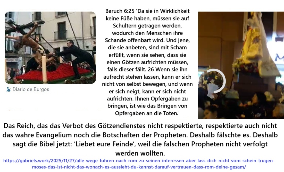 Das Reich, das das Verbot des Götzendienstes nicht respektierte, respektierte auch nicht das wahre Evangelium noch die Botschaften der Propheten. Deshalb fälschte es. Deshalb sagt die Bibel jetzt: ‘Liebet eure Feinde’, weil die falschen Propheten nicht verfolgt werden wollten.
