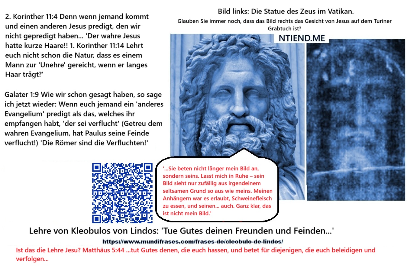 Korinther 11:4 Denn wenn jemand kommt und einen anderen Jesus predigt, den wir nicht gepredigt haben… ‘Der wahre Jesus hatte kurze Haare!! 1. Korinther 11:14 Lehrt euch nicht schon die Natur, dass es einem Mann zur ‘Unehre’ gereicht, wenn er langes Haar trägt?’