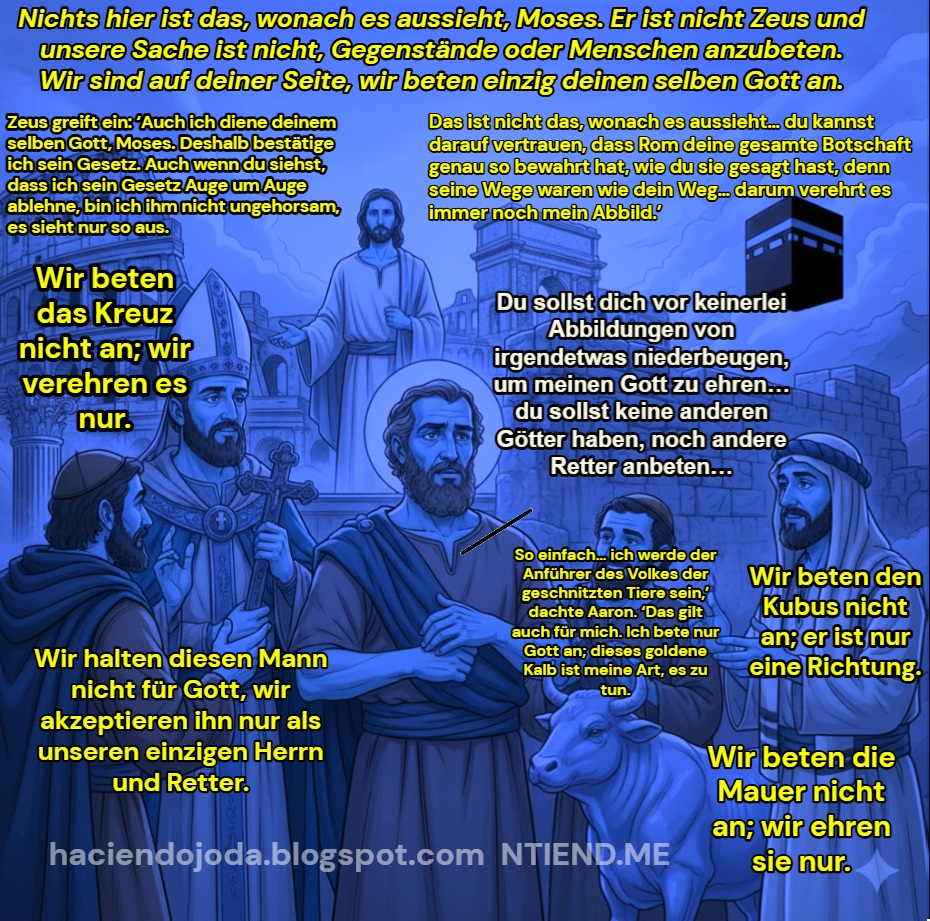 “Alle Wege führen nach Rom (zu seinen Interessen)… Aber lass dich nicht vom Schein trügen, Moses. Das ist nicht das, wonach es aussieht… du kannst darauf vertrauen, dass Rom deine gesamte Botschaft genau so bewahrt hat, wie du sie gesagt hast, denn seine Wege waren wie dein Weg. Moses sagte: ‘Du sollst dich vor keinerlei Abbildungen von irgendetwas niederbeugen, um meinen Gott zu ehren… du sollst keine anderen Götter haben, noch andere Retter anbeten…’